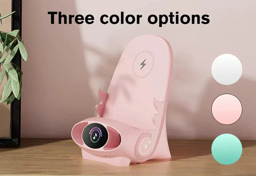 Unique and novel, the wireless charging/mobile phone holder function can be placed horizontally or vertically, and there is a sound hole at the bottom to make the sound more three-dimensional when the phone is playing.
