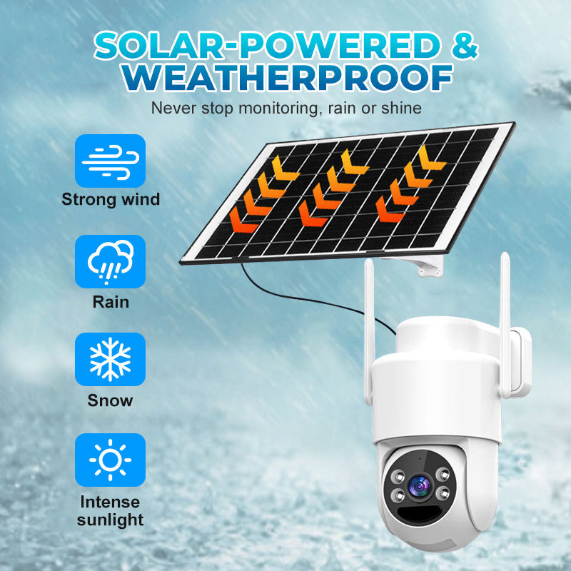 SOLAR-POWERED & WEATHERPROOF DESIGN: Never worry about dead batteries or harsh weather. This camera charges via solar power and features an IPX6 waterproof rating, ensuring uninterrupted operation in rain, snow, or extreme temperatures.